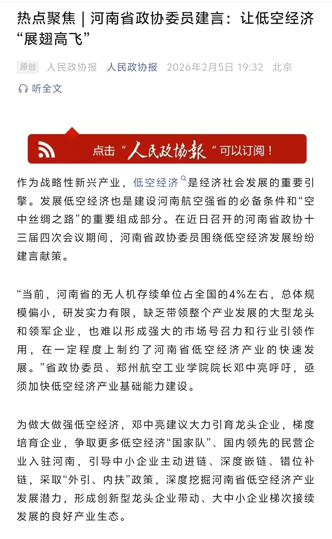 在近日召开的河南省政协十三届四次会议期间,省政协委员、我校校长邓中亮院士,省政协委员、我校经济学院院长郝爱民教授围绕河南省低空经济高质量发展积极建言献策,贡献“郑航智慧”。人民政协报新媒体对此进行了报道。